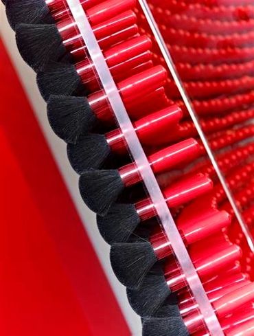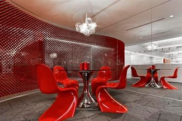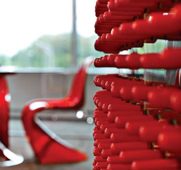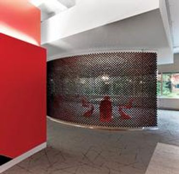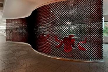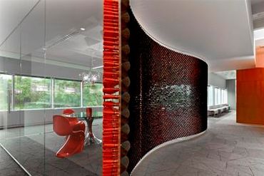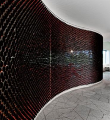 A 30-foot clear undulating floor-to-ceiling wall creates a barrier to the employee café . Over 8000 make-up brushes create the translucency in Highland Architect's design. Panels were CNC routed and then custom-formed in a custom large-scale oven.